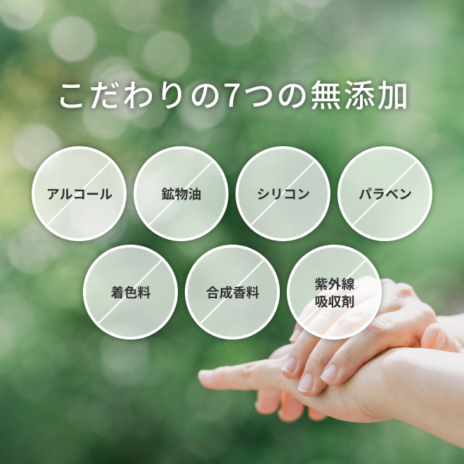 天然由来の成分を中心に、できるだけシンプルな無添加(※)処方にもこだわりました。お子さまや敏感肌の方にもお使いいただける、やさしい使い心地です。