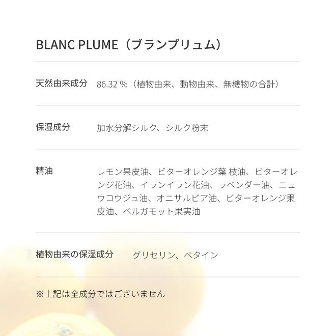 ○精油: レモン果皮油、ビターオレンジ葉 枝油、ビターオレンジ花油、イランイラン花油、ラベンダー油、ニュウコウジュ油、オニサルビア油、ビターオレンジ果皮油、ベルガモット果実油