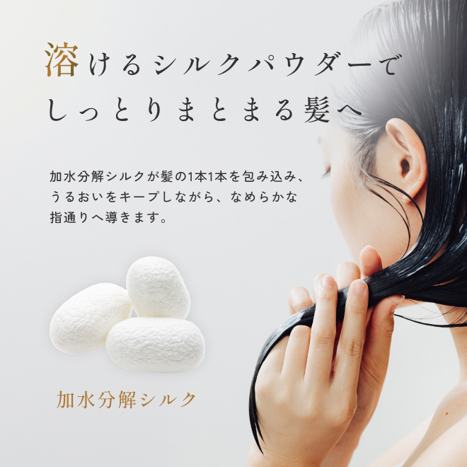 溶けるシルクパウダー(加水分解シルク)が髪の1本1本を包み込み、うるおいをキープしながら、なめらかな指通りに導きます。