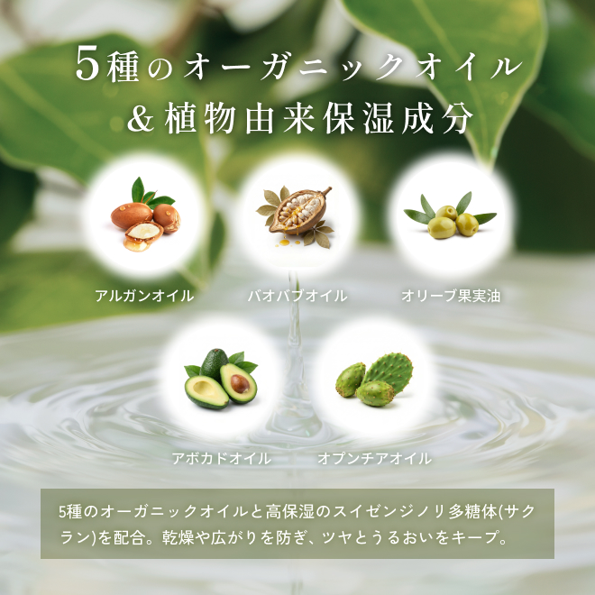保湿成分として、5種のオーガニックオイルに加え、高保湿のスイゼンジノリ多糖体(サクラン)も配合。