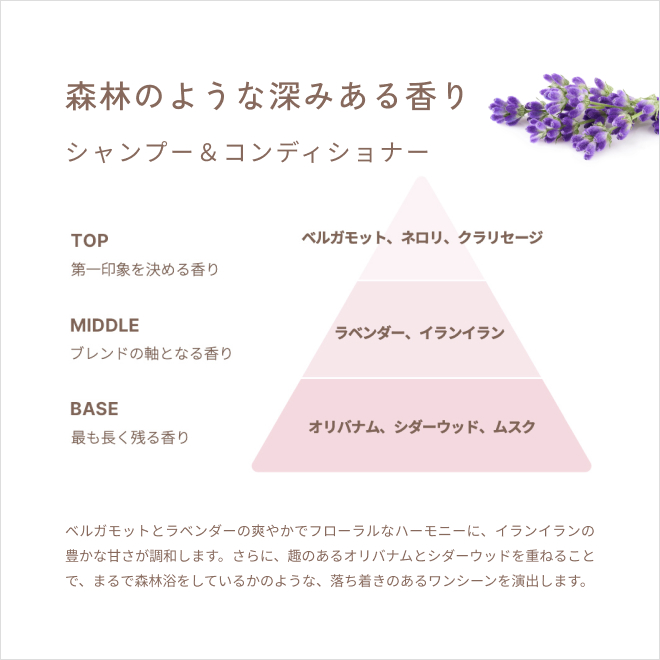 ベルガモットとラベンダーの爽やかでフローラルなハーモニーに、イランイランの豊かな甘さが調和します。さらに、趣のあるオリバナムとシダーウッドを重ねることで、まるで森林浴をしているかのような、落ち着きのあるワンシーンを演出します。
