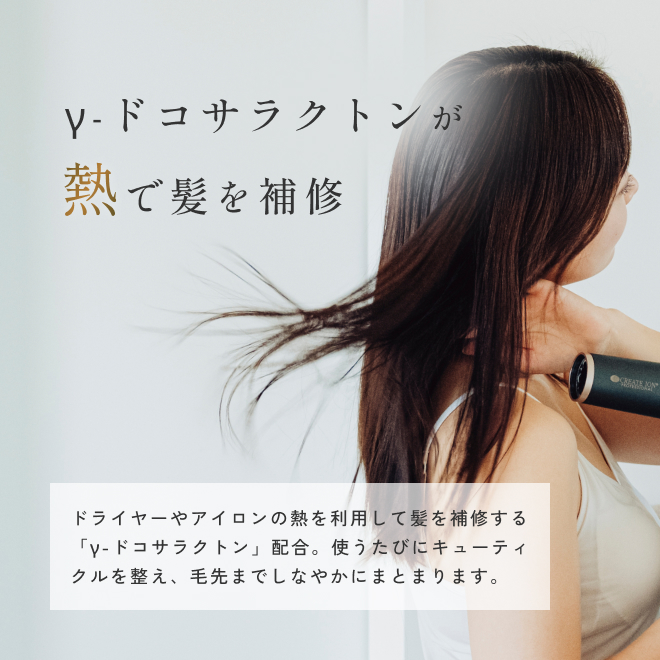 さらに、ドライヤーやアイロンの熱を利用して髪を補修する「γ-ドコサラクトン」配合。