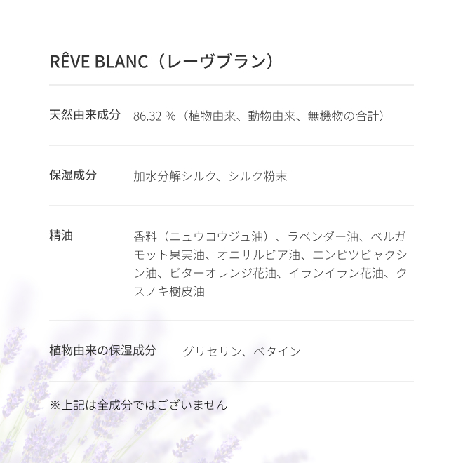 ○精油:香料(ニュウコウジュ油)、ラベンダー油、ベルガモット果実油、オニサルビア油、エンピツビャクシン油、ビターオレンジ花油、イランイラン花油、クスノキ樹皮油