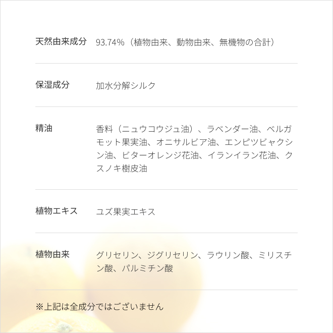 ○精油:レモン果皮油、ビターオレンジ葉/枝油、ビターオレンジ花油、イランイラン花油、ラベンダー油、ニュウコウジュ油、オニサルビア油、ビターオレンジ果皮油、ベルガモット果実油