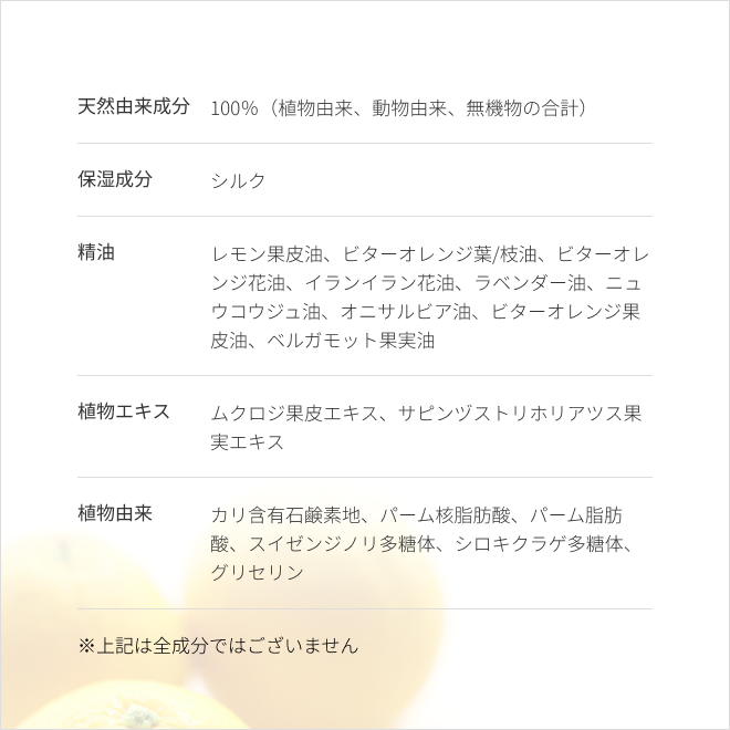 ○精油:レモン果皮油、ビターオレンジ葉/枝油、ビターオレンジ花油、イランイラン花油、ラベンダー油、ニュウコウジュ油、オニサルビア油、ビターオレンジ果皮油、ベルガモット果実油