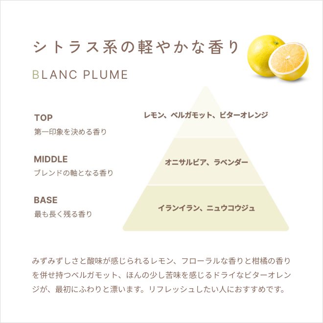 ブランプリュムは軽やかさの中にある爽やかさと甘さが特徴的な香りで、リフレッシュしたい人におすすめです。みずみずしさと酸味が感じられるレモン、フローラルな香りと柑橘の香りを併せ持つベルガモット、ほんの少し苦味を感じるドライなビターオレンジが、最初にふわりと漂います。やまがシルクについて