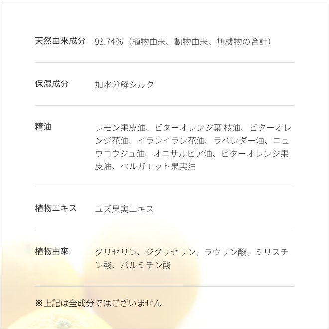 ○精油:レモン果皮油、ビターオレンジ葉/枝油、ビターオレンジ花油、イランイラン花油、ラベンダー油、ニュウコウジュ油、オニサルビア油、ビターオレンジ果皮油、ベルガモット果実油