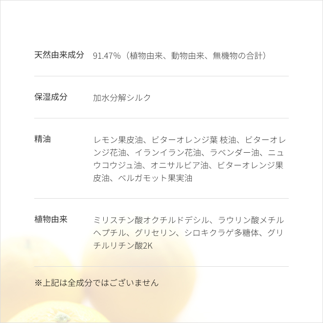 ○精油:レモン果皮油、ビターオレンジ葉/枝油、ビターオレンジ花油、イランイラン花油、ラベンダー油、ニュウコウジュ油、オニサルビア油、ビターオレンジ果皮油、ベルガモット果実油