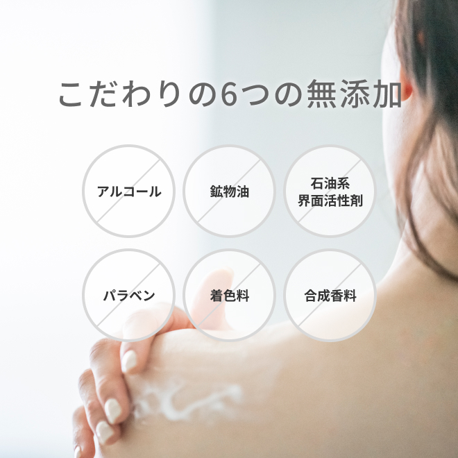 天然由来の成分を中心に、できるだけシンプルな無添加*処方にもこだわりました。お子さまや敏感肌の方にもお使いいただける、やさしい使い心地です。
