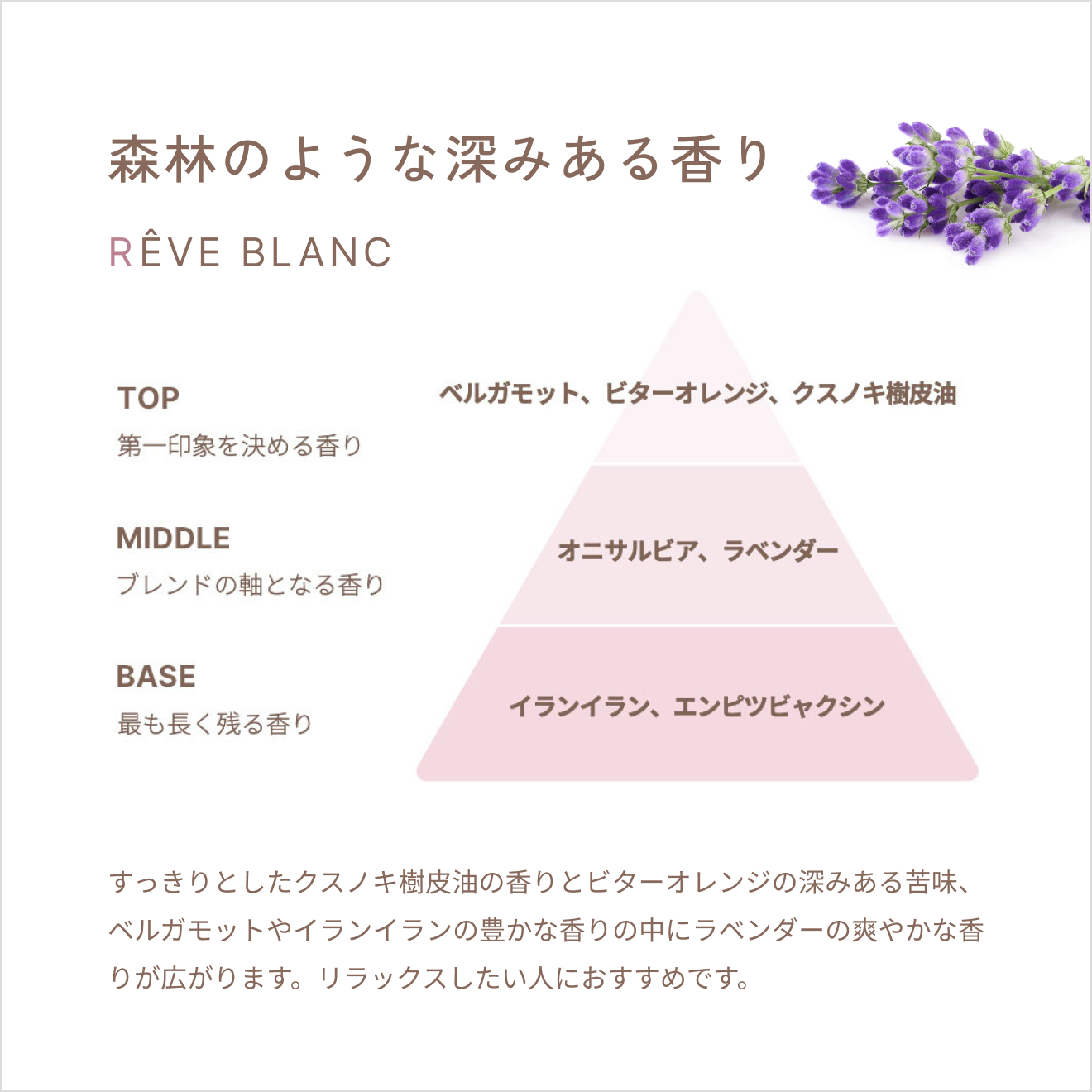 〇精油:香料(ニュウコウジュ油)、ラベンダー油、ベルガモット果実油、オニサルビア油、エンピツビャクシン油、ビターオレンジ花油、イランイラン花油、クスノキ樹皮油